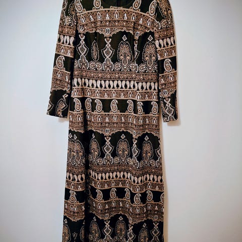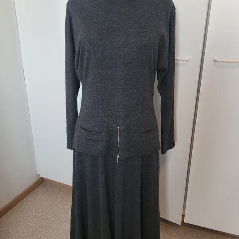 Mustapohjainen, luultavasti pellavaa, ei kuitenkaan rypisty helposti.