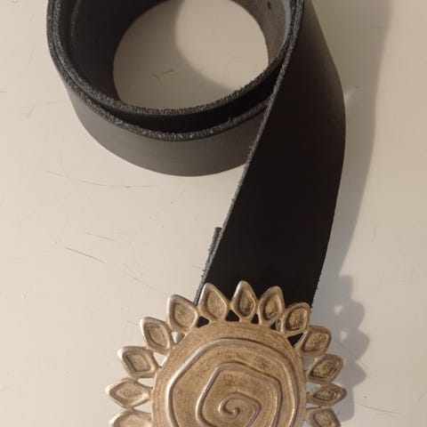 Käytetty,aito nahka vyö Marja Kurki.Väri musta, sisältää näky käytetty jäljet . Ulkopuolella kaikki kunnossa .Koko, viimeinen reikä 98 cm.kohdalla.Tietysti saa lisää tai "vähemmän".Oma laatikko.