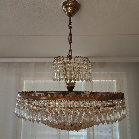 Näyttävä valaisin. Kullanhohtoa ja kristalleja. Noin 60x60x60 cm. Kettinki 30 cm (60 cm:sta). Postitus (23e), toimitus (pk, 10e / AB-metroasemat, 5e) tai haku. ● Myydyt poistan. Ei tarvitse varmistella löytyykö vielä. ● Ei minkäänlaisia toridiilejä.