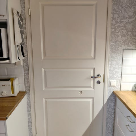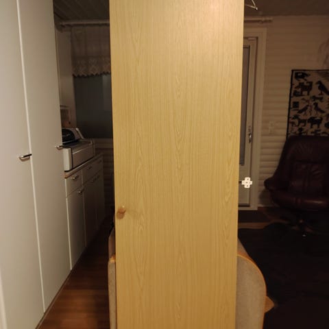 Hyväpintainen sisäovi karmeineen. Koko 70 cm leveä ja 210 cm korkea. Normimitta . Ei kynnyskarmia . Painike ei kuulu kauppaan. Helppo maalata.