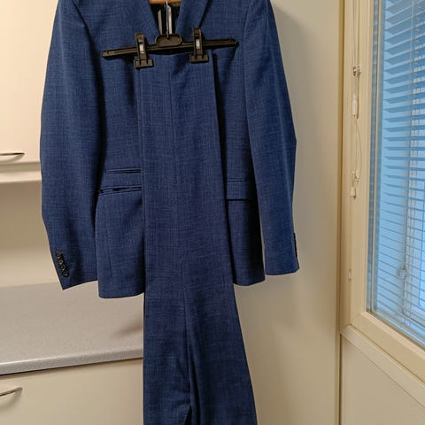 Myydään kuvan tummansininen juhlapuku. Sopii hyvin esimerkiksi hääpuvuksi, missä käytössä itsellä (175cm, 78kg) on ollut.