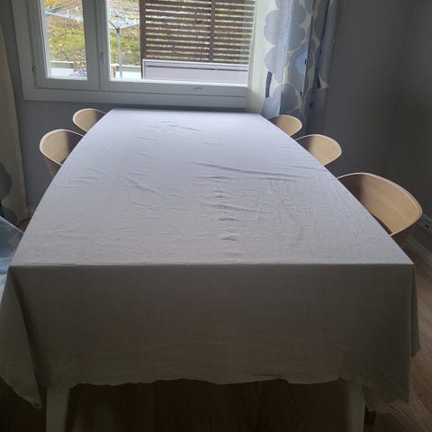 Tämän kankaan reunat joku huolitellut saumurilla. Joskys pidetty, kaapissa pitkään ollut. Saatan heittää vielä pesukoneen kautta. Jotain hailuja jälkiä paikkapaikoin reunassa oli. Yleisilme siisti. Kuvattu auringossa, varjot kuvassa.