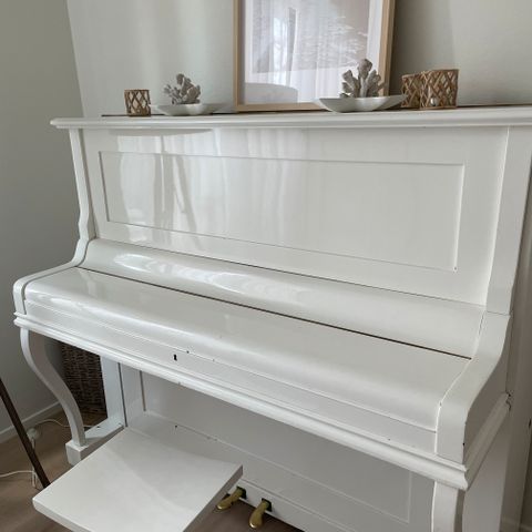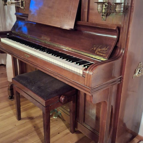 Näyttävännäköinen tummanruskea antiikkipiano kynttiläjaloilla sisustuselementiksi. Ei vireessä/soittokuntoinen. On ajan tuomaa kulumaa, joka kuulunee asiaan.