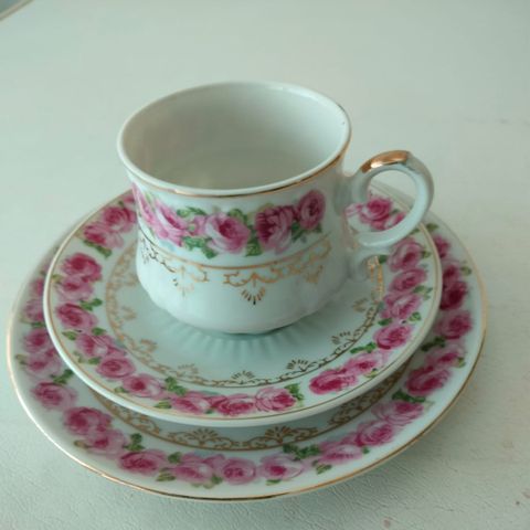 Kauniit, erittäin hyväkuntoiset kahvikupit, luuposliinia, 9 kpl kuppeja ja lautasia, 4 kpl pullalautasia yht. 38 e + mahdolliset postikulut