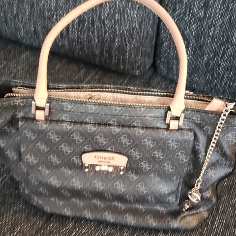 Myydään vähän käytetty Guessin laukku / käsilaukku / olkalaukku / satchel / crossbody. Musta-harmaa keinonahka logokuvioinnilla. Pohja, olkahihnat ja pitkä irrotettava olkahihna kiiltävää mustaa keinonahkaa. Vuorikangas kukallinen vaaleanpunainen, myös ulkosivutaskussa. Ei naarmuja, kulumaa, tms. Täysin moitteeton kunto.