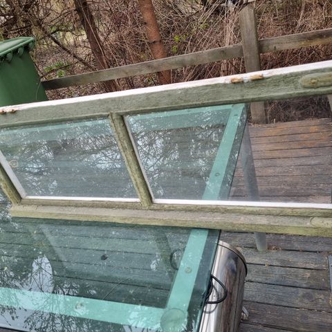 Puinen ikkunakehys vihreällä maalipinnalla. Sopii erilaisiin sisustus- tai korjausprojekteihin. Sopii käytettäväksi myös koristeena. Lasi on rikki.