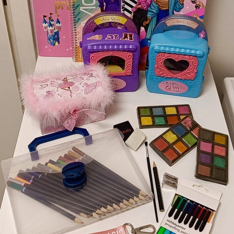 Uudenveroinen askartelukirja, yli 10 leimasinta, Top Model -taskuvärityskirja ja tuoksuvahaliidut.