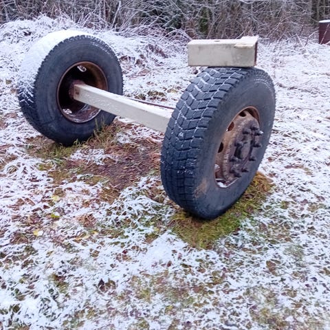 Peräkärryn akseli hyväkuntoisilla renkailla.