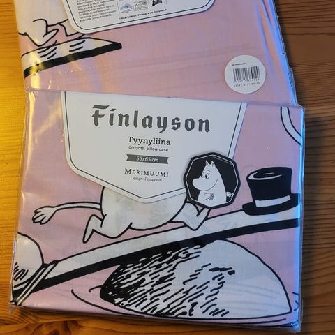 Käyttämättömäksi jäänyt lasten tyynyn kokoinen muumi tyynyliina. Vaaleansinisen värikäs.