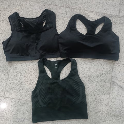 Myydään kuvan mustat topatut treeniliivit, joissa takana hakaskiinnitys.