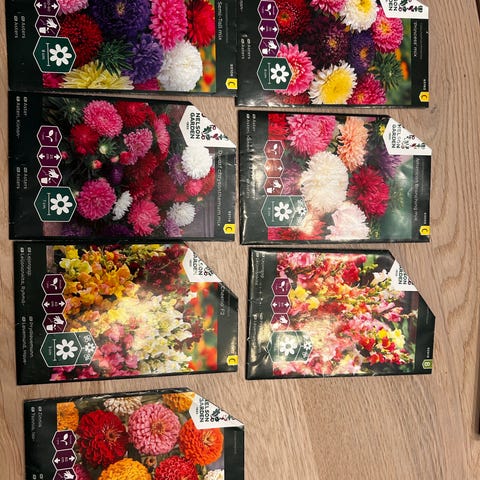 Kukkien siemeniä, mm. punakosmos, samettikukka