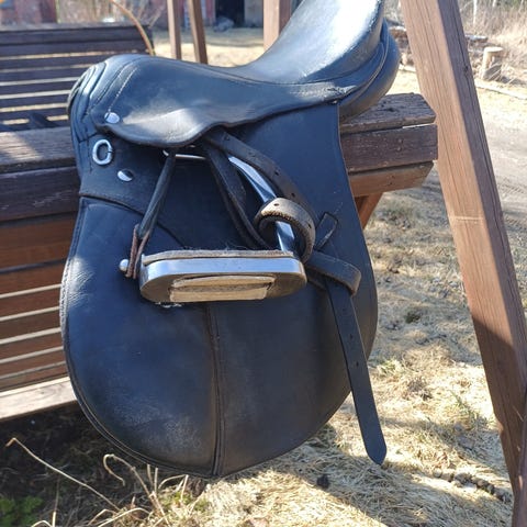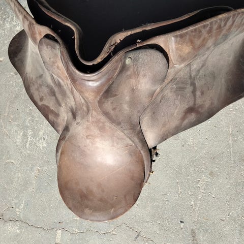 Ilmeisesti nahkainen? hevosen satula. Satulan takakaaressa metallinen lenkki, kenties häntäremmiä varten?