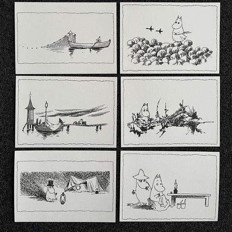 Kuusi virheetöntä postikorttia postin keräilypakkauksessa Muumit heräävät kevääseen. Ei merkkejä. Kuoressa merkintöjä.