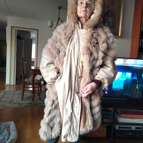 Toinen puoli keinoturkis ja toinen puoli kangasta jolloin karva jää näkyviin kauluksessa ja hihansuissa.