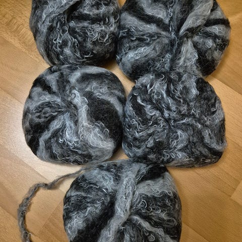 Tummansinistä Pörriäinen-lankaa. Nimensä mukaisesti kyseessä on mohairia sisältävä pörrölanka. 5 täyttä kerää (50g) ja yksi vajaa, jossa 14g jäljellä. Yhteensä siis 264g lankaa. Tarkempia tietoja kuvissa (mm. materiaalitiedot).
