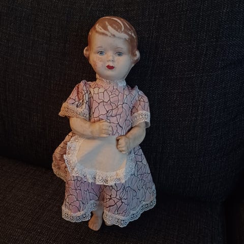 Posliini pää, kädet, jalat ja vartalo kankaasta, aivan ihana vanha nukke. Rustiikkinen ilme kun on mekon helmapitsit kuluneet osittain pois, ja silmäripsiä puuttuu, kasvoissa jotain peiteltävää naarmua, vartalo on hyväkuntoinen ja kengät hyvät. Nukketohtorille vähän projektia, on näinkin aivan hieno koriste, vaikka mieluummin näkisikin kaikki korjattuna. niskassa joku valmistajan merkintä, ehkä vain pään valmistusnumero?