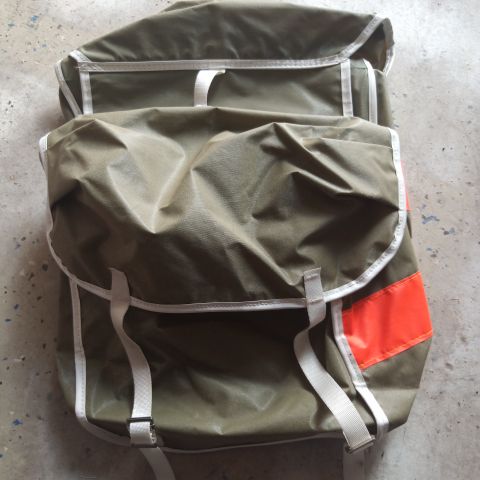 Musta-siniset pyörälaukut 2 kpl. Laukun leveys alhaalta 25 cm, ylhäältä 30 cm, syvyys 10 cm. Ylempien kiinnikkeiden väli 18 cm ja korkeusero alempaan kiinnikkeeseen 26 cm. Kangas ei pidä vettä. Molemmissa ison vetoketjullisen taskun lisäksi pienempi sininen vetoketjutasku heijastimella.