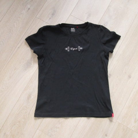 Musta, vähän juhlavampi paita. Kokolappua ei ole, mutta veikkaisin kokoa M/L. Kai-kai 56cm.
