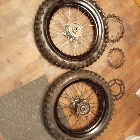 Yamaha Dt enskat vanteineen, eturengas nasta rengas ja käyttämätön takarengas kulunu näkyy kuvissa. Irto kumit on oikiat bridges stonet eturenkaassa vielä kohtuullisesti pintaa ja takarengas ehtoo puolella näkyy kuvissa . Nuo dt enskat saa 60 eurolla ja irtokumit 20 eurolla, jos haet kaikki pois pyörimästä nii 70e yhteis hinta. Koot näkyy kuvissa jos jotain epäselvää kysy.