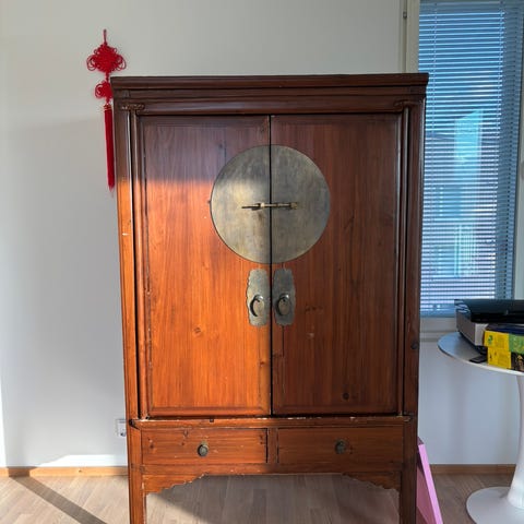 Kaunis vanha kiinalainen kaappi erittäin hyvässä kunnossa. Ostettu Böknäsistä monta vuotta sitten. Kaunis koristeellinen huonekalu, joka sopii moneen sisustukseen. Sisällä on kaksi laatikkoa ja kolme hyllyä. Kaappi on valmistettu kokonaan puusta ja siinä on puiset liitokset. Kuvissa näkyy leima. On mahdotonta löytää toista tällaista vanhaa ja aitoa huonekalua. Koko: L 90 S 39 K 145