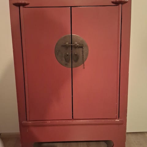Kaunis vanha kiinalainen kaappi erittäin hyvässä kunnossa. Ostettu Böknäsistä monta vuotta sitten. Kaunis koristeellinen huonekalu, joka sopii moneen sisustukseen. Sisällä on kaksi laatikkoa ja kolme hyllyä. Kaappi on valmistettu kokonaan puusta ja siinä on puiset liitokset. Kuvissa näkyy leima. On mahdotonta löytää toista tällaista vanhaa ja aitoa huonekalua. Koko: L 90 S 39 K 145