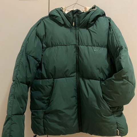 Dressmann toppatakki, koko S. Sävy on harmaaseen taittava hillitty ja tyylikäs vihreä. Takissa on irrotettava huppu, vetoketjulliset etutaskut, vetoketjullinen povitasku sekä nepparilla suljettava povitasku.