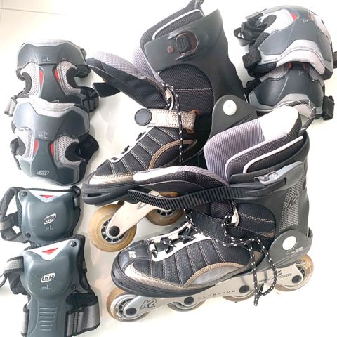 Hyväkuntoiset ja laatuiset miesten rullaluistimet (koko 46) ja suojavarusteet (polvi-, kyynärpää- ja rannesuojat). Suojat ovat kuvassa omassa verkkokassissaan, ovat uudenveroisia kunnoltaan.
