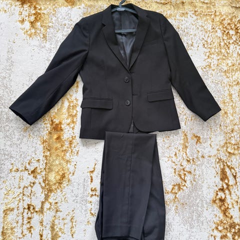 Hyväkuntoinen, lasten puvuntakki. Koko 146, merkki LUHTA. Väri musta, takissa kapea tummanharmaa liituraitakuvio.