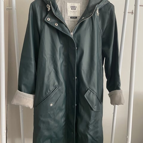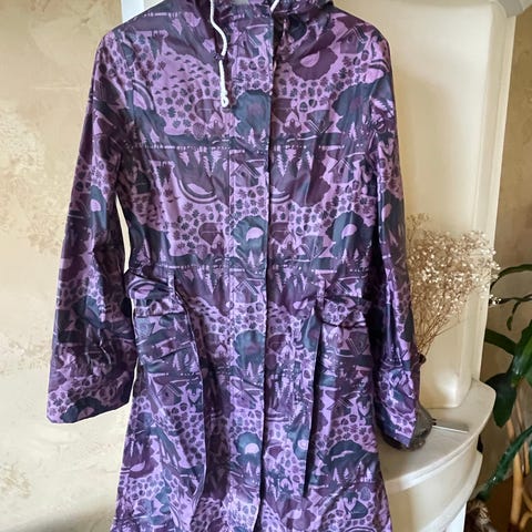 Laadukas uudenveroinen tanskalaisen Normann-merkin vedenpitävä mukavan kevyt ulkoilutakki. Ihanan keltainen, valitettavsti jäänyt itselle pieneksi ja käyttämättä. Useita taskuja, povitasku, vyötäröllä kiristys, samoin helmassa. Ehkä ennemmin reilu XS kuin pieni.