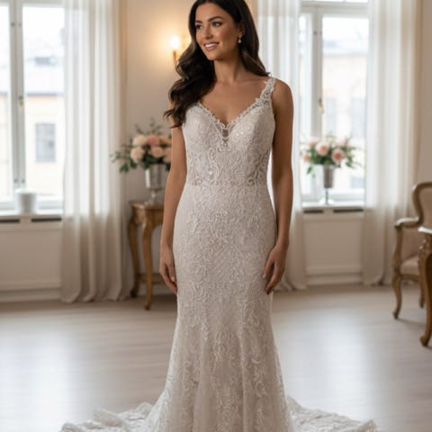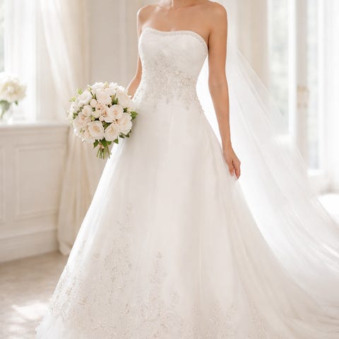 Eddy K Couture, valkoinen, koko M. Tuntuu käsittämättömän ylelliseltä päällä! Puvussa on upea pitkä laahus jossa kauniit pitsiyksityiskohdat. Hameosa on todella monikerroksinen, yläosa klassisen kaunis. Mukana pehmeä muhvi.
