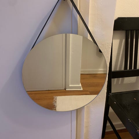 Peili ripustetaan seinälle mustalla ripustusremmillä.