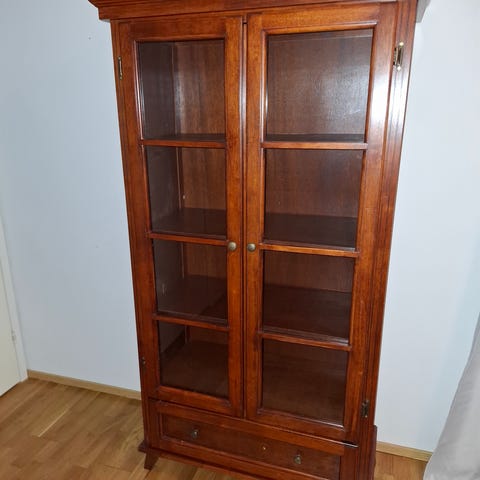 Mustaksi käsitelty suurikokoinen vitriini. Pinta hieman epätasainen ja kärsinyt, saisi pienellä laitolla ihan hyvään kuntoon. Vain nouto Tampereelta
