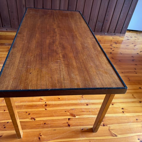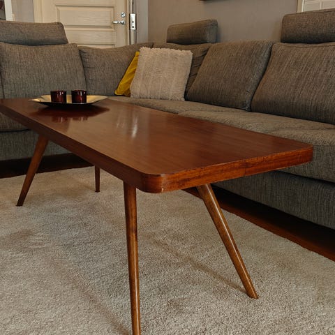 Teak- tai mahonkipintainen sohvapöytä 1950-60 luvuilta. Ikäisekseen siistissä kunnossa, pinnassa toki jonkin verran ajan tuomaa kulumaa. Mustat metalliset alaspäin kapenevat jalat.