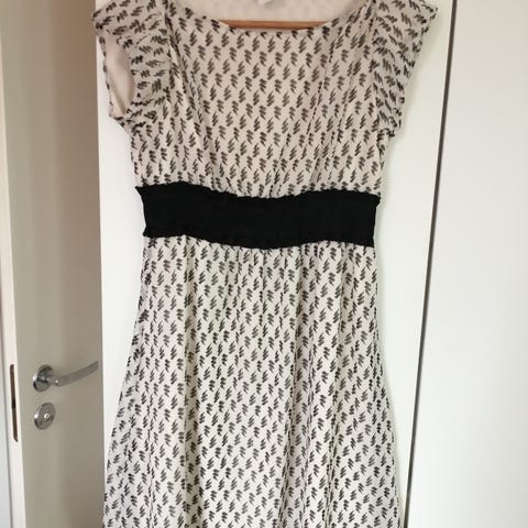 Kaunis, kesäisen keltainen mekko koossa M. Vyötäröltä melko tiukka eikä jousta. Merkki muistaakseni Vila, mutta laput leikattu pois.