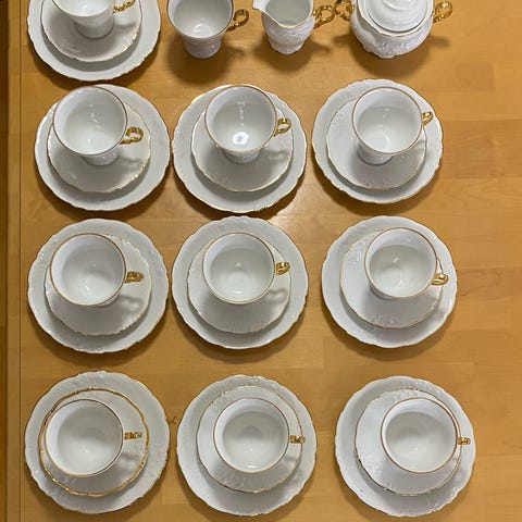 6 kahvikuppia, 6 kahvilautasta, 6 lautasta, kermakko ja sokerikko