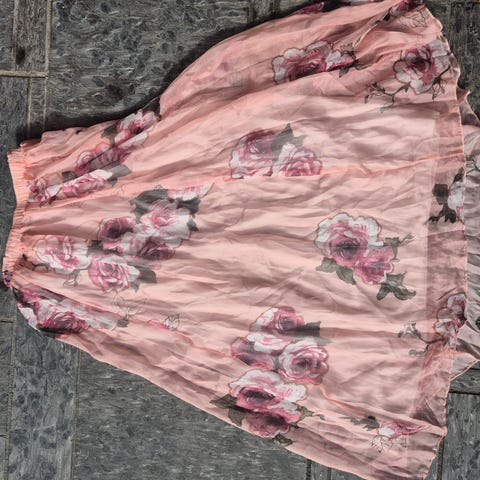 Musta valkokukkainen hame, joustavaa viskoosipuuvillaa.