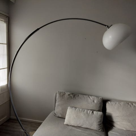 Tummanruskea valaisin vanhalla pistokkeella. Suositeltavaa vaihtaa johto. On iso ja painava.