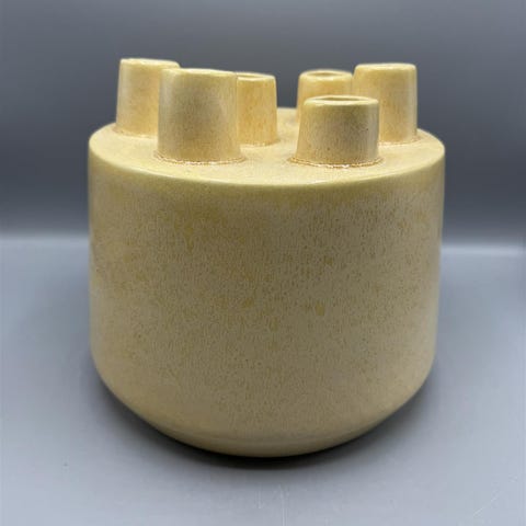 Myydään raidallinen maljakko, keramiikkaa, värit luonnonvaalea ja keltainen. Maljakon korkeus 20,5 ja yläosan halkaisija 12,5 cm.