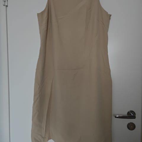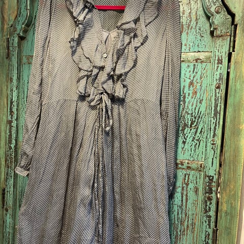 Myydään hieno silkki mekko, pitkät kapeat hihat, sivutaskut, edessä putkihelmi koristeet.