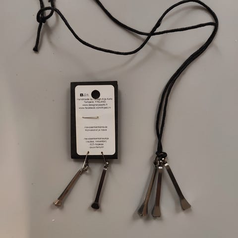 Marko Björsin suunnittelema Laukka-sarjan hopeiset korvakorut ja kaulakoru . Tämä tyylikäs kaulakoru ja korvakorut on valmistettu 925 hopeasta.