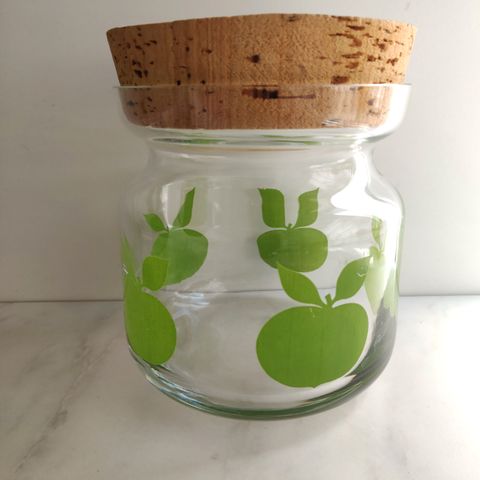 Vintage lasipurkki punaisilla omenakuvioilla. Korkeus 9,5 cm, suuaukon läpimitta 10,5 cm.