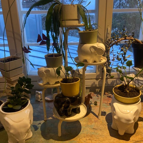Olleet kukkapurkkeina, kunto kohtalainen. Erikoiset norsuaiheiset emalimukit, oranssi ja sininen. Yhteishinta 5 euroa.