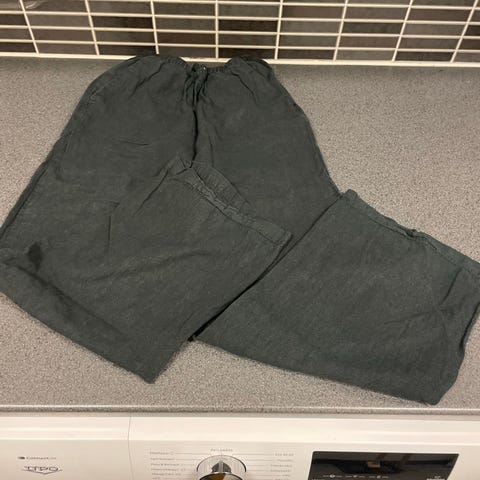 Myydään valkoiset pellavahousut, jotka ovat kevyet, hengittävät ja mukavat päällä.