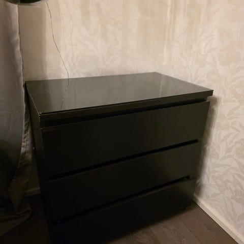 Tukevat ja painavat kalusteet. Lasivitriinissä valo. Voi tarjota myös erikseen kalusteista.