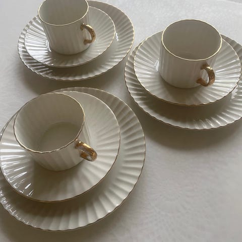 Upea astiasto, jossa yli tusina tätä kokonaisuutta, jossa kuppi, lautanen ja asetti. Hinta per kuppi, lautanen ja asetti 15€.