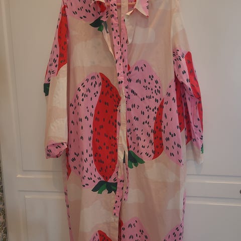 Pari kertaa päällä ollut Marimekon mekko. 100% Puuvillaa. Taskut ja vyötäröllä samasta kankaasta vyö, mutta on kiva myös suorana ilman vyötä tai aukipidettynä esim topin ja housujen kanssa.