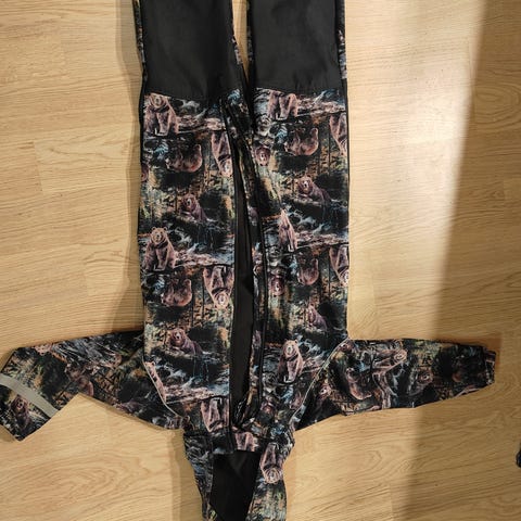 Guppy merkkinen kukallinen välikausipuku, koko 122cm. Ehjä ja siisti, polvissa ja pepussa hieman pehmentymää ja vähäistä tummentumaa. Irroitettava huppu, jalkarinksut uupuu mutta napit löytyy niitä varten. Puku on käytön jälkeen pesty.