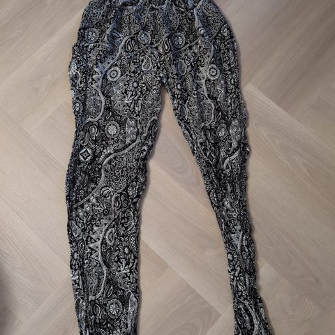 Ihanat rennot housut, joissa pehmeä materiaali (puuvilla tai viskoosi, materiaalilappu puuttuu). Taskut sivuilla ja joustava kuminauhavyötärö & solmittava nauha. Rento istuvuus.