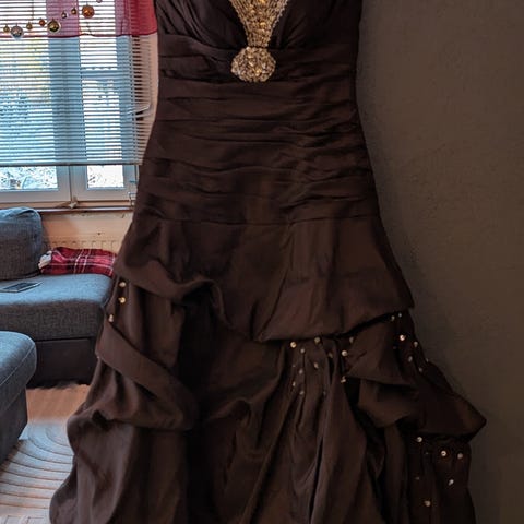 Savunharmaa tai hopeanharmaa iltapuku/juhlapuku/vanhojentanssimekko uuteen kotiin. Kauppaan kuuluu myös mekkoon kuuluva, samaa kangasta oleva käyttämätön hartiahuivi.