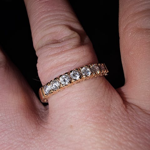 Tyylikäs Naisten kultainen ( 14 c) rivisormus, viidellä timantilla, koko n 18 mm, hp 320 e. Ei kaiverruksia. (Arvio kultasepällä n.750 e) Kulkeutuu Sjoen ja Kurikan suuntaan.